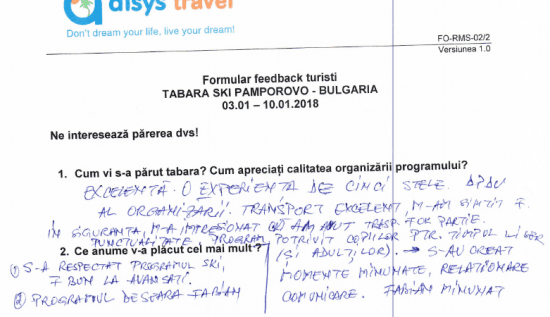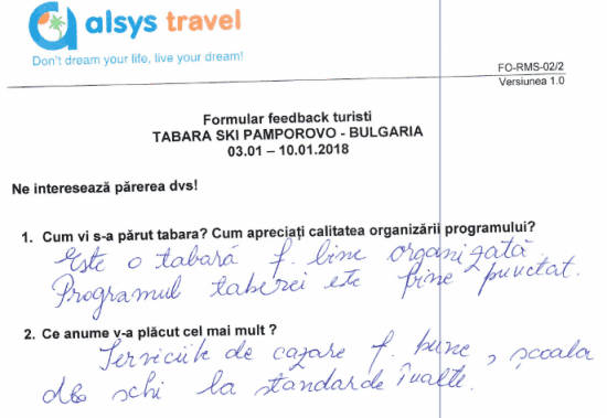 "O echipa minunata, oameni de valoare, tabara la inalt nivel! FELICITARI! A doua oara in tabara din Bulgaria! Super ne-am simtit! La anul din nou pe partia din Pamporovo! Multumim, Alsys Travel !"