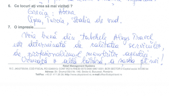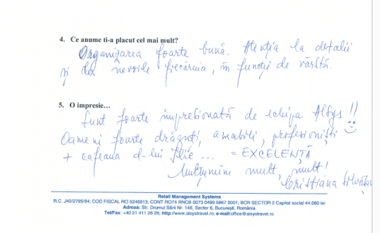 “Extraordinari! Mi-a placut foarte mult implicarea celor de la Alsys travel, iar soferul cu care am fost in Bulgaria, domnul Iliuta, a condus extraordinar. Sunteti o echipa minunata!”