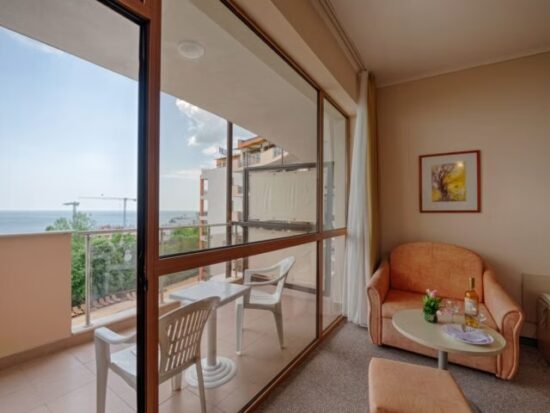 - Fiecare cameră include TV, aer condiționat, baie, balcon, uscător de păr și o terasă mare.